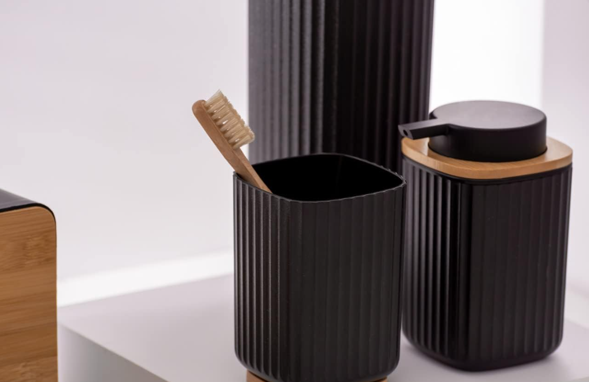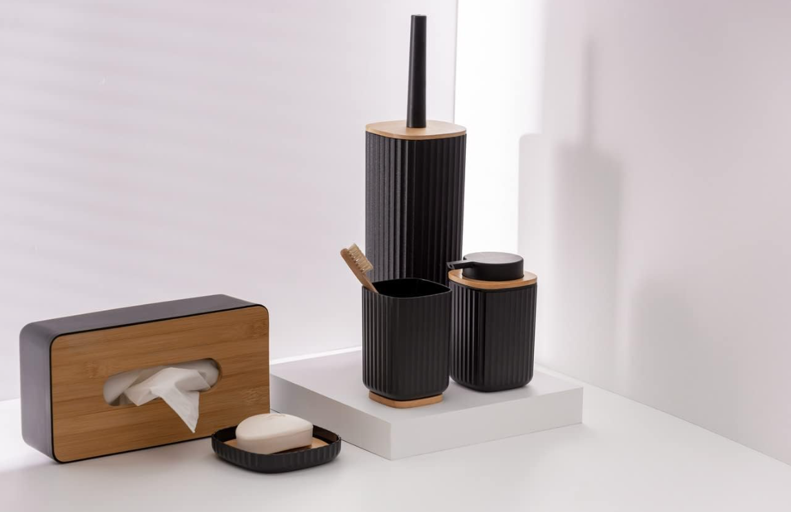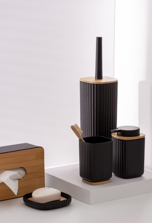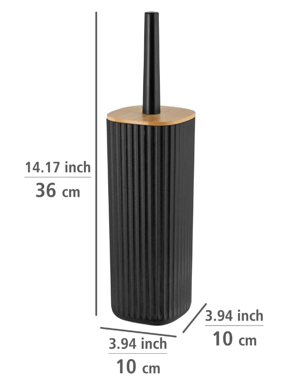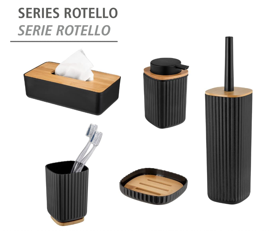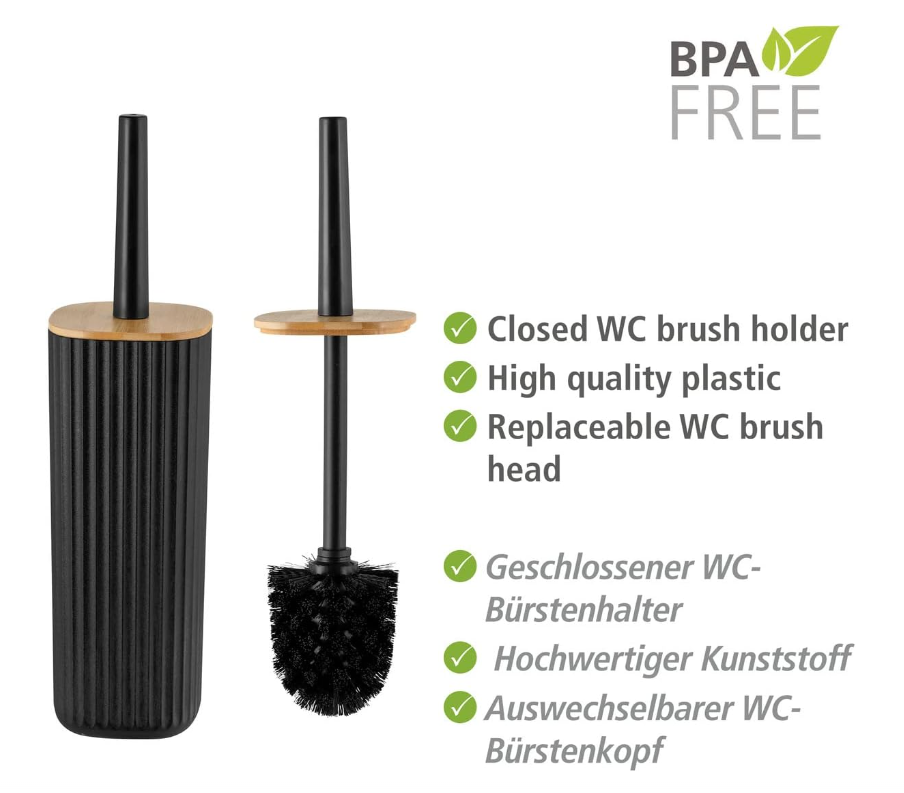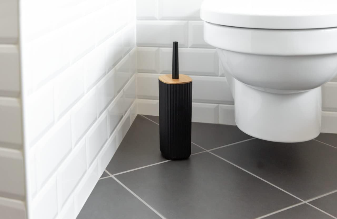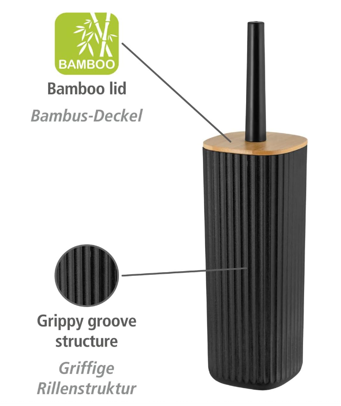 מברשת ניקוי לשירותים בדגם Rotello העשוי מפלסטיק בצבע שחור מחוספס עם מכסה במבוק
