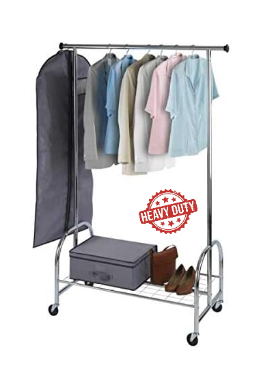 מתלה בגדים ונעליים על גלגלים ממתכת בצבע כרום מתקן טרנדי וחזק היכול לשאת עד 100 קג' מדף תחתון מרשת לנעלים גובה 185 סמ', רוחב 121 סמ', עומק 52 סמ'
