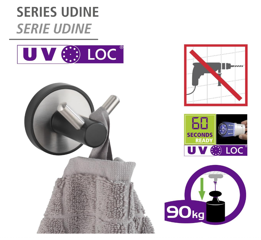 מתלה כפול עגול למגבות בצבע כסף מט ושחור אשר אינו מצריך קידוח המתקן נדבק לקיר בטכנולוגיית ®UV-Loc – זוכת פרס חדשנות בגרמניה. המוצר נדבק ל אריחים, זכוכית, אבן, שיש ומתכת. חזק – כושר נשיאה עד 90 קג' – גם מגבות רטובות קוטר 5 סמ' פשוט וקל – ממקמים את המתקן במקום הרצוי, מסירים את המדבקה, ממלאים אותו בחומר המצורף האמצע, מאירים עליו במשך דקה עם הנורה המצורפת בערכה – זהו התושבת חזקה וניתן להמשיך להרכיב את המתקן במלואו. כדי להסיר את התושבת – כווונו מייבש שיער על חום במשך 2 דק'
