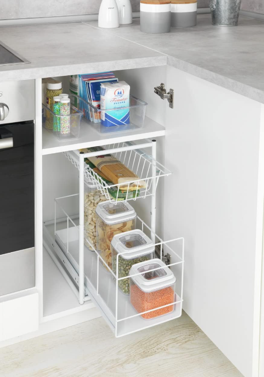 מתקן יעיל וחסכוני היכול להכיל בקבוקים בתחתית ותבלינים במגירה העליונה, או חומרי ניקוי ואביזרי מטבח