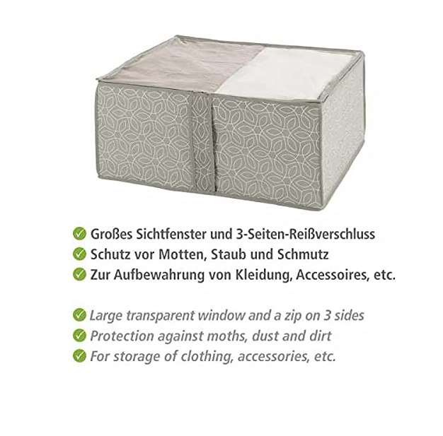 קופסת אחסון M מכסה עליון שקוף מבד נושם פוליפרופילן דפנות קשיחות עם רוכסן לאורך 3 צלעות וידית נשיאה רוחב 55 סמ', אורך 40 סמ' , גובה 20 סמ' ניתן להעמיד אחד על גבי השני הודות לצלעות הקשיחות, וכן לאורך אם המדף גבוה