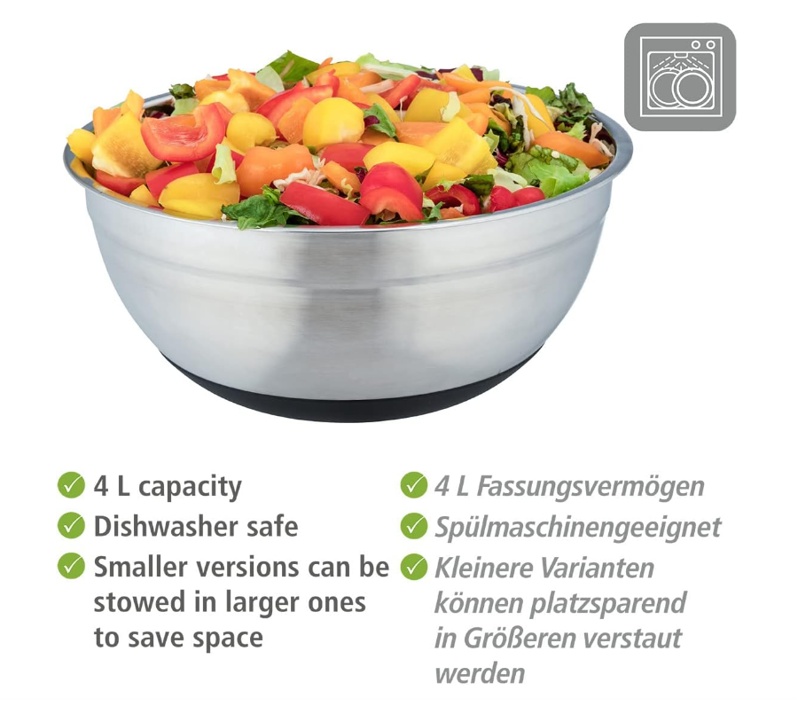 קערת גדולה מנירוסטה עם תחתית סיליקון שחורה למניעת החלקה – 4L